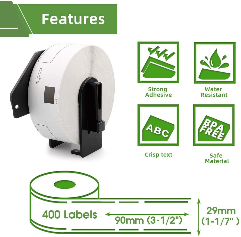 Brother DK1201 | Standard Address White Paper Labels (400 labels) These 1.1 in x 3.5 in (29 mm x 90.3 mm) die-cut black on white address labels are durable, tough, and work with QL label printers. Learn more now.
