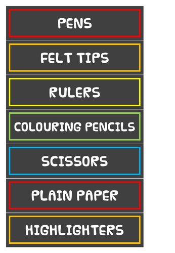 Tray Labels - School Supplies - K-3 Teacher Resources Home › Teaching Resources › General and Display Resources › Tray Labels – School Supplies Use these tray labels to label your storage drawers or your student’s trays. These tray labels measure 26cm x 6.5cm when printed at A4 size. These tray labels are available as a PDF or an editable Word document. Downloads Editable Word Version PDF Version