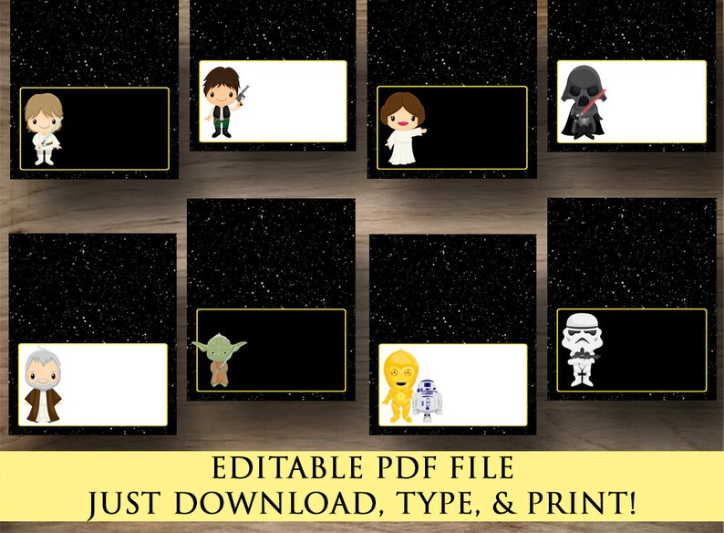 Free Star Wars Party Printables - The Quiet Grove 12 Food tent cards (Wookie Cookies, Han Rolos, Ewakomole, Leia's Buns, Light Sabers, Obi Wan Kabobs, Droid Dip, Death Star Donuts, Vader Veggies, C-3P Oreos, Hut Dogs, Palpatine's Pizza) 3 drink wrappers (Luke Sky-water, Yoda- Soda, & Vaderade) a May the Force Be With You Popcorn Box May the Force Be With You Pennant Banner Star Wars Party Printables - Free Download - Party with Unicorns Today's set of party printables includes: Star Wars Party Invitations. Star Wars Waterbottle Labels. Star Wars Birthday Banner. Star Wars Thank-you Cards. Star Wars Chocolate Bar Wrappers. Star Wars cupcake Toppers and Wrappers. The set can be downloaded from the Freebie Library. By joining our mailing list you will be access to our freebie ... Star Wars • Free-Printables.com Free Printable Star Wars Storm Trooper Party Tags. July 30, 2017 Characters, Cupcake Topper/Party Circles, Party, Star Wars, Water Bottle Labels. Free Printable Star Wars Themed Reading Logs. July 17, 2017 Education, Reading Logs, Star Wars. Free Printable Star Wars Valentines. January 16, 2017 Holiday, Party, Star Wars, Valentine's Day. Star Wars Theme Inspired Party Printables - DIY Inspired Let's start with the free printables. These printables are great for any Star Wars inspired party and can be used for food labels, snack bags, party favors, and water bottle labels. You can get the free printables here: Star Wars Theme Inspired Party Printables I suggest printing them on card stock, but regular paper works fine too.